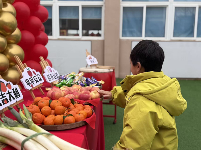 幼儿园的老师们提前准备了趣味满满的 “祈福打卡” 。孩子们在老师的引导下,有序触摸寓意吉祥的物品:轻轻触摸大蒜,寓意 “能掐会算”,愿宝贝们心灵手巧、聪慧过人;手握青翠大葱,祝福 “聪明绝顶”,愿孩子们勤学好问、机智活泼;拿起饱满橘子,期盼 “大吉大利”,愿宝贝们平安健康、顺遂无忧;品尝甜蜜棒棒糖,祝愿 “属你最棒”,愿每个孩子自信阳光、勇敢向前。